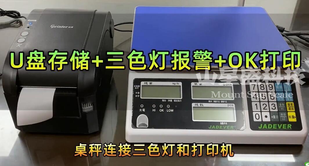 電子計數(shù)秤配備三色報警燈、打印機(jī)及U盤,產(chǎn)品數(shù)量OK合格時綠燈亮起,保存數(shù)據(jù)并打印,產(chǎn)品LO低于或HI高于定量值時警示燈黃色或紅色亮起,并大報警聲提示。